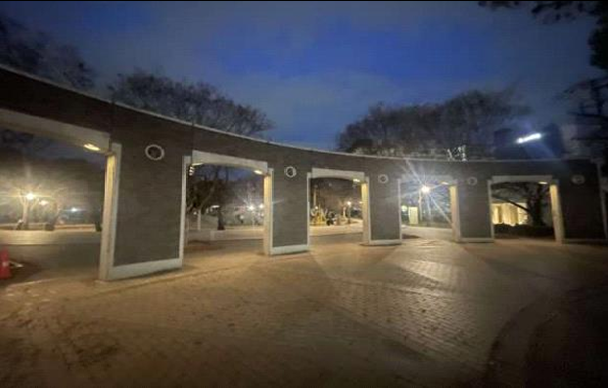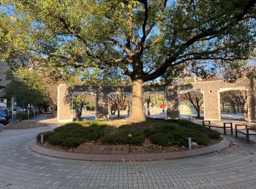 シンボルツリーのクスノキがそびえる南東角にあるエントランスです。