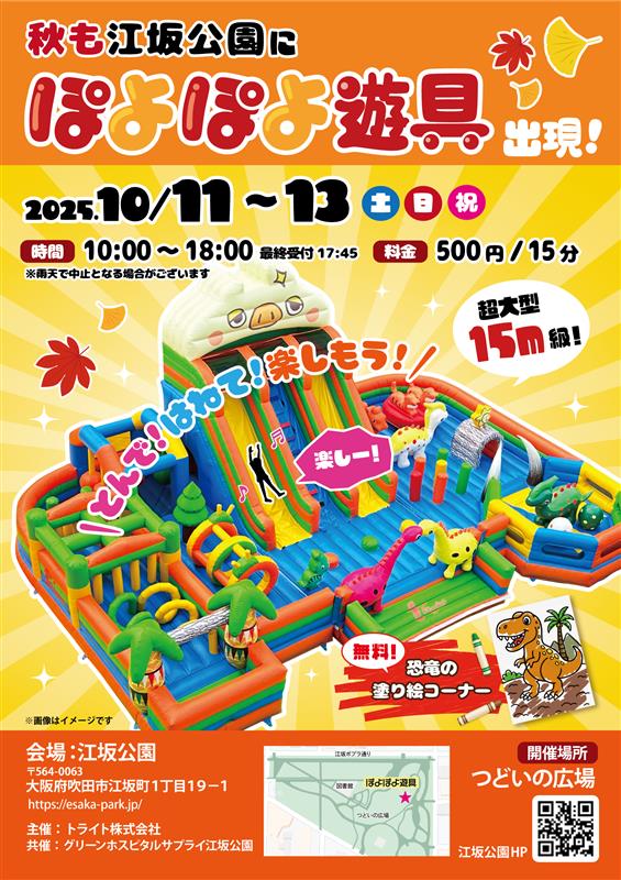 イベント 江坂公園にぽよぽよ遊具がやってくる! jpu-esaka 2025-09-292025-09-29 park-PFI、江坂公園ぽよぽよ楽しいバルーン遊具が江坂公園に登場します🎉🎈🌞今回は恐竜のぬり絵コーナーも登場!楽しいこと間違いなし!ぜひ遊びに来てくださいね!===================江坂公園 ぽよぽよ遊具【期 間】2025/10/11(土)~2025/10/13(火)【営業時間】10:00~18:00【料 金】15分500円【対象年齢】3歳~小学生以下※雨天で中止となる場合がございます。===================
