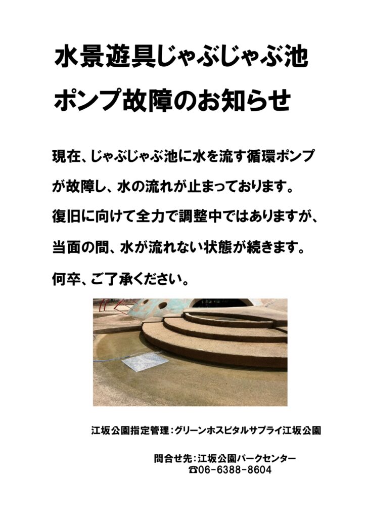 お知らせ 水景遊具じゃぶじゃぶ池 ポンプ故障のお知らせ jpu-esaka 2025-10-03 park-PFI、江坂公園いつも江坂公園をご利用いただきありがとうございます。このたび、江坂公園ちびっこ広場内「水景遊具じゃぶじゃぶ池」がポンプ故障のため使用不可となっております。以下の通りご案内いたします。大変ご迷惑をお掛けしますが、ご理解、ご協力のほどよろしくお願いいたします。