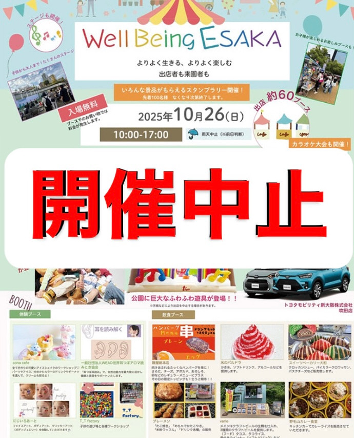 お知らせ 【お詫び】10/26(日) WellBeingESAKA開催中止のお知らせ jpu-esaka 2025-10-252025-10-25 park-PFI、Well Being ESAKA、江坂公園いつも江坂公園をご利用いただき、ありがとうございます。明日、10/26(日)開催予定のWellBeingESAKAは天候不良のため開催中止とさせていただきます。楽しみにしてくださっていた方、大変申し訳ございませんが、何卒ご理解の程よろしくお願いいたします。次回は11月22日(土)にFun step感謝祭が開催予定です。引き続き江坂公園をよろしくお願いいたします。