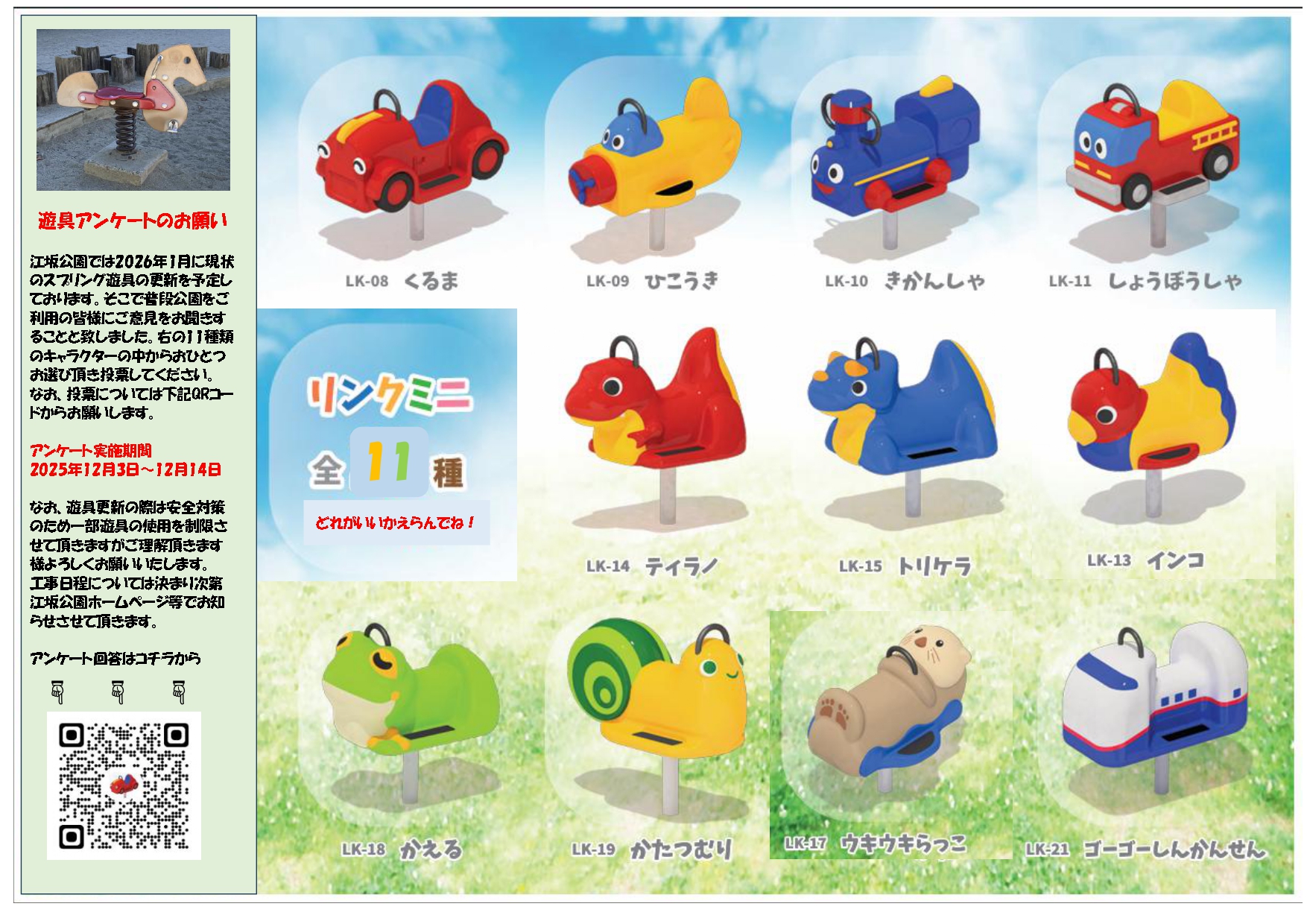 江坂公園では2026年1月に現状のスプリング遊具の更新を予定しております。