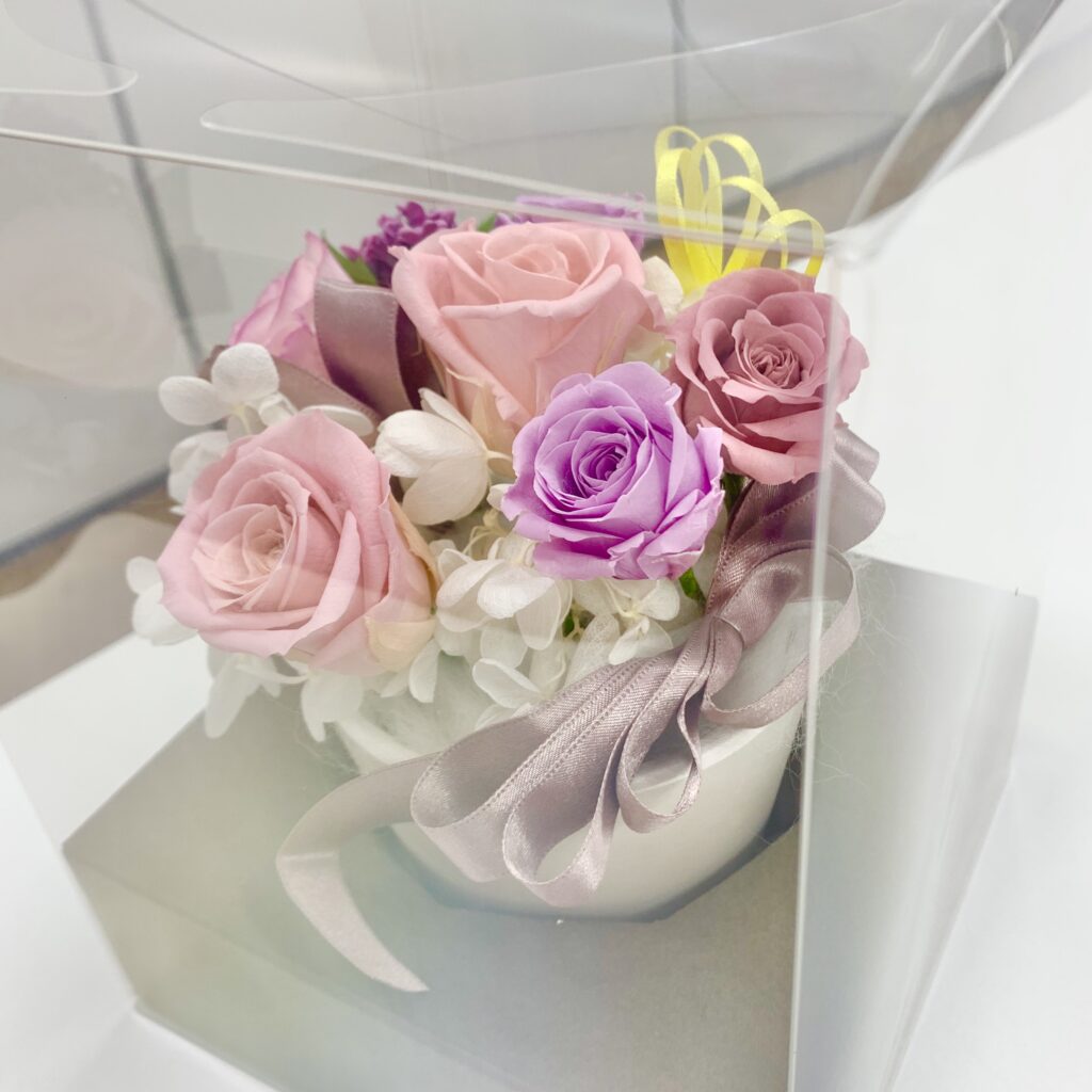 | 内容 | 水やり不要のプリザーブドフラワーのアレンジ体験講座。 ワイヤリングなど基本を学びながら陶器にアレンジします。 ケース付き。 |