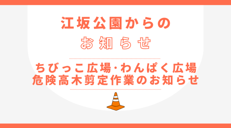 続きを読むいつも江坂公園をご利用いただきありがとうございます。このたびちびっこ広場及びわんぱく広場エリア、危険高木の剪定作業を行います。工事期間中は安全確保のため、ちびっこ広場の一部遊具・わんぱく広場のバオバブ遊具が利用できなくな