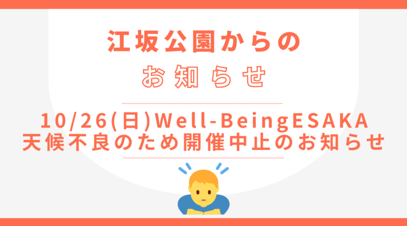Read Moreいつも江坂公園をご利用いただき、ありがとうございます。 明日、10/26(日)開催予定のWellBeingESAKAは天候不良のため開催中止とさせていただきます。 楽しみにしてくださっていた方、大変申し訳ございませんが、